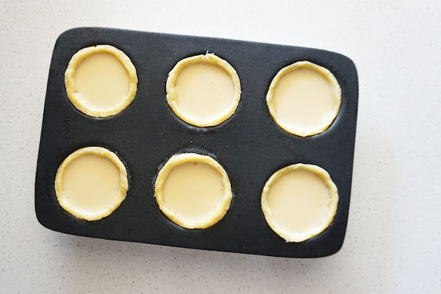 Roll out pastry into roughly 1/4 inch thick and 30cm x 30cm, big enough for 6 nos 10cm circles to line the muffin tins.