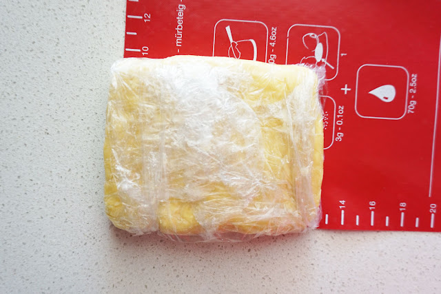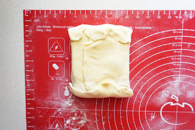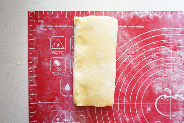Repeat the above folding one more time - Roll out pastry into 30cm long and 20cm wide. Don't forget to lightly dust with flour as required. Repeat one third fold left and one third over it as above. Wrap pastry in cling film, refrigerate for at least 30 minutes and until firm.
